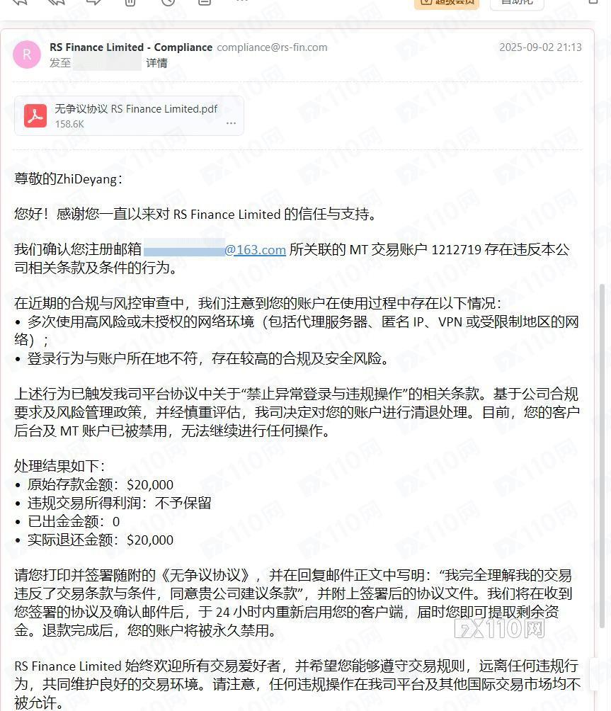 我在RS Finance進行交易,入金20000美金盈利了21687.02美金,準備去出金的時候發現帳號被封禁,緊接著就是郵件發現有一封郵件說我帳號因為IP地址經常變動懷疑我使用了VPS,然後要扣除我的盈利。我實在是費解為什麼不能使用VPS進行交易,平台的規則也沒說。