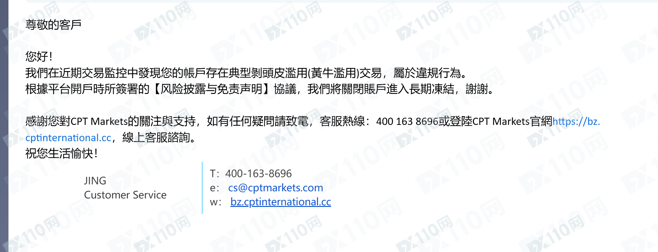 CPT Markets平台無緣無故關閉我帳戶,不能登陸不能出金。目前平台告知我違規交易,黃牛交易手法,但是我不是IB沒有用這個手法刷單