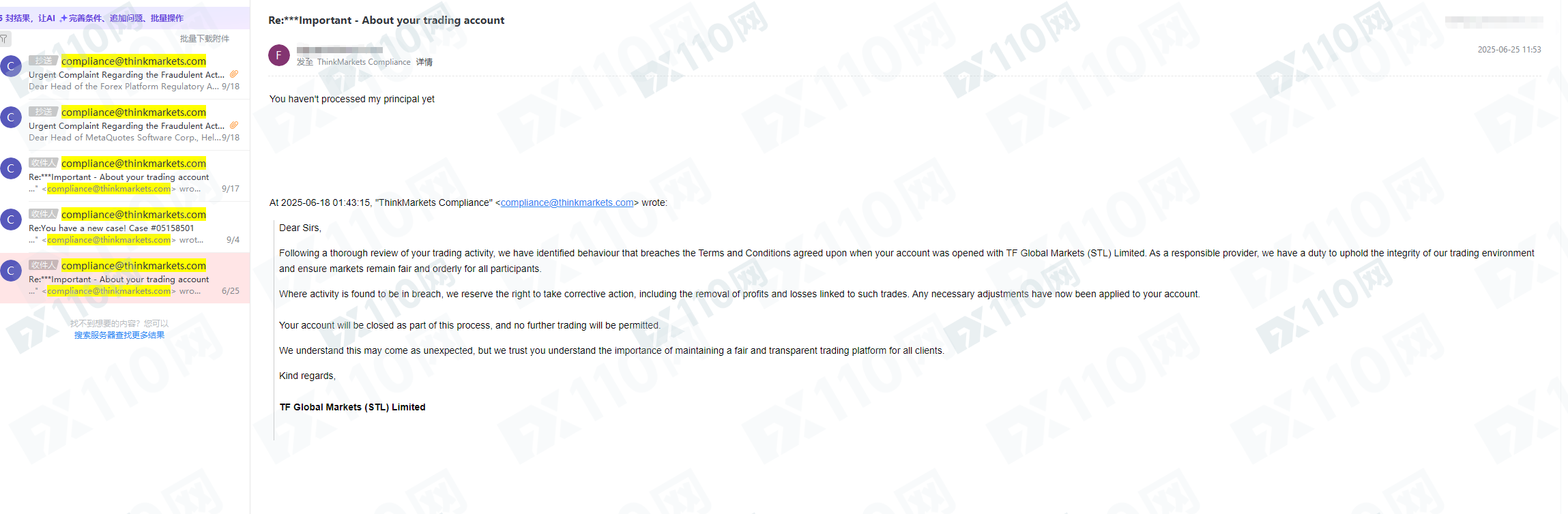 今年4~5月份入金了30000USD,在2025年6月10日,由於單邊行情,我的帳戶產生了收益,隨之不久後我收到一封來自thinkmarkets平台的郵件,聲稱我參與了非法活動,並通知我他們將調整帳戶餘額並關閉我的帳戶!他們不僅扣除了我全部利潤43,685USD,我嘗試出金本金30000USD三個月以來一直不予處理!三個月以來我多次聯繫智匯平台索取我的本金和利潤,該平台都是置之不理,沒有任何反應!我甚至投訴了監管,他們是黑平台,根本不會被合法監管,大家千萬不要來這個平台! ! ! !