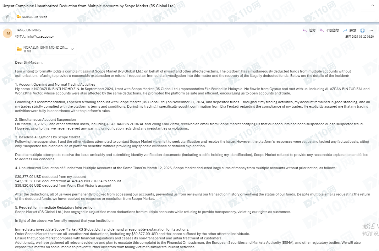 本人已向CySEC,FSC提交正式投訴,指控Scope Market (RS Global Ltd)涉嫌金融詐欺。
