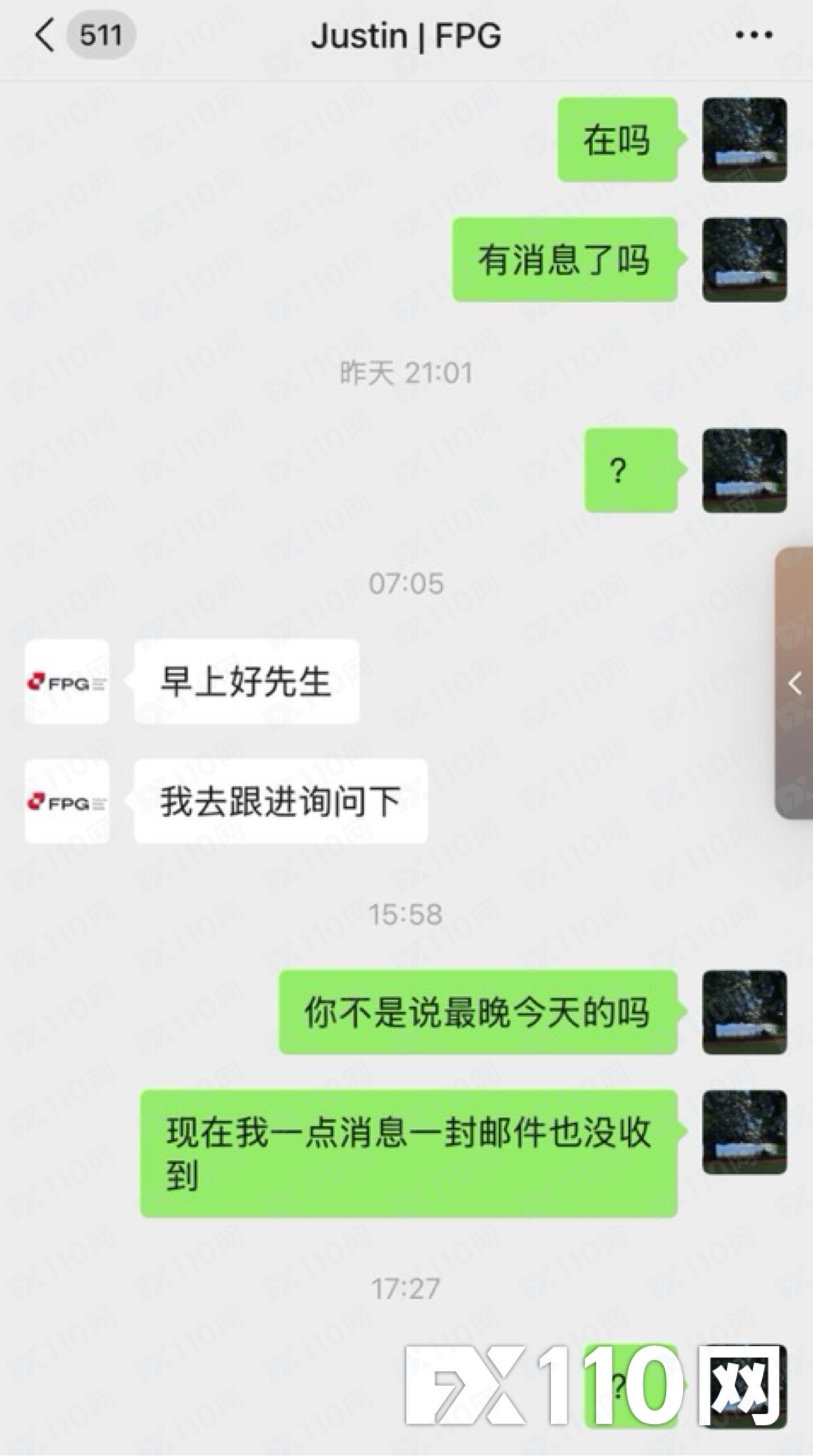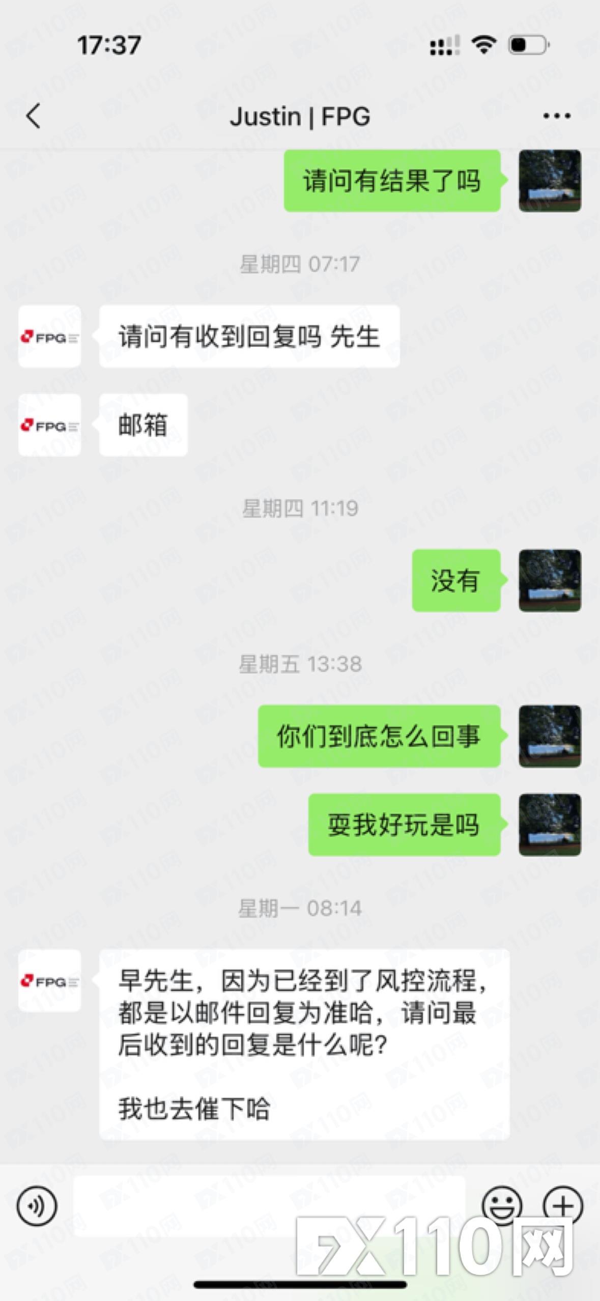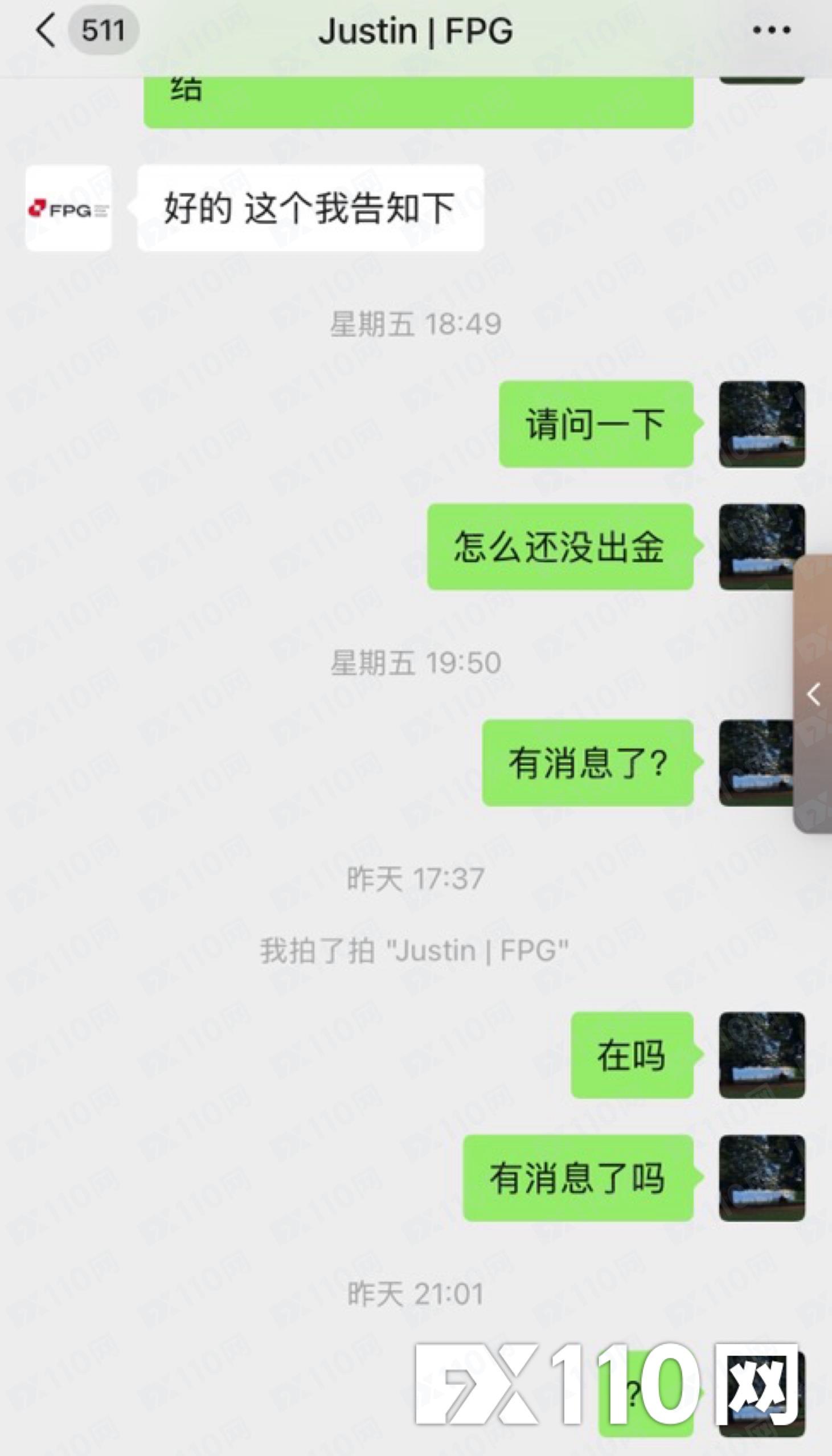 2025年2月12日在FPG平台入金500美金,盈利2054美金,卻不給出金 ,總金額2554,嘗試出金一直顯示待審核,平台沒有任何回复,也沒有收到相關郵件。 3月20日平台郵件回覆說明需進行二次KYC驗證,於是我又進行了KYC驗證,驗證便一直沒有消息。 3月26日FPG客戶經理要我刪除在FX110的投訴,客戶經理說最早3月28日便可以出金,最晚4月1日出金,隨後我便完結了在FX110的投訴,3月31日昨天給客戶經理發送消息問詢進度,沒有得到任何回复,今天有問詢進度依舊是沒有得到任何消息以及郵件,截止目前本金和盈利均未出金,我遭到了他們平台的欺騙,跟我說刪投訴就能出金,這就是一個騙子黑平台。