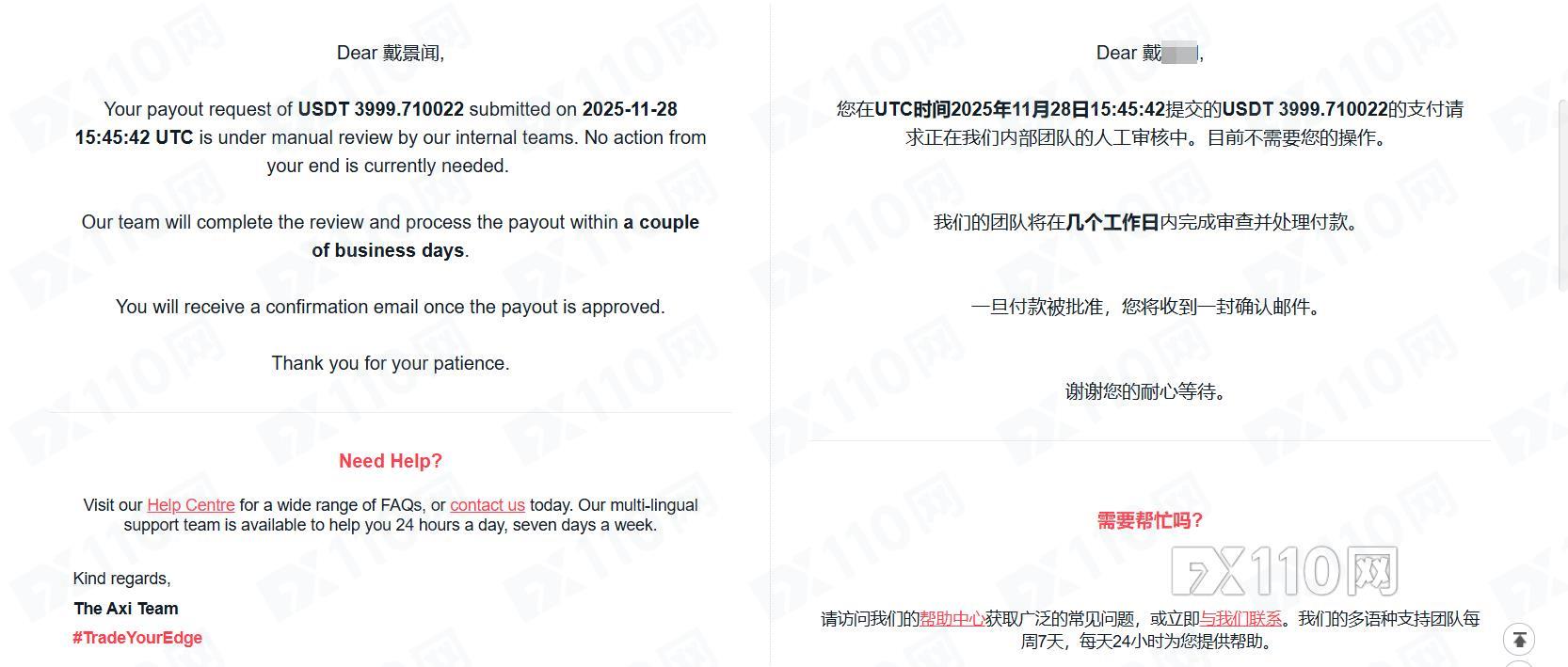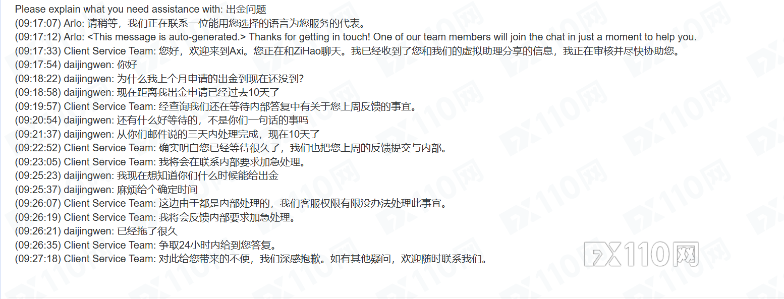 每次找平台,平台總是以相關部門審核等各種理由拖延,平台答應處理完成出金的時限一再拖沓,到規定的時限一問就是還在審核,出個金審核一個月,明顯就是不給客戶出金,望外匯110替我主持公道,幫忙聯絡Axi歸還我的交易資金。謝謝!