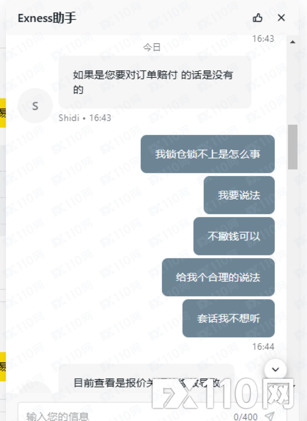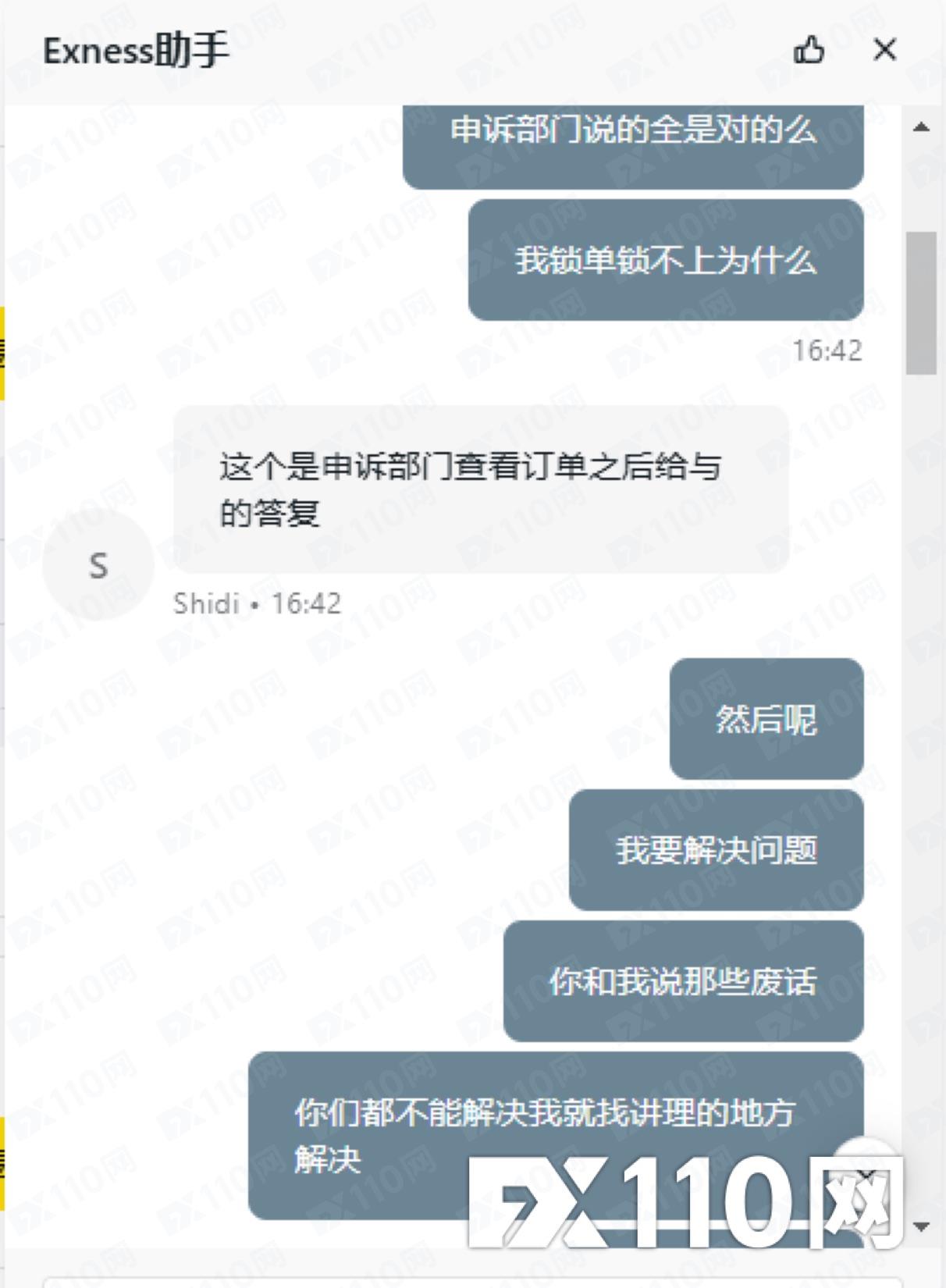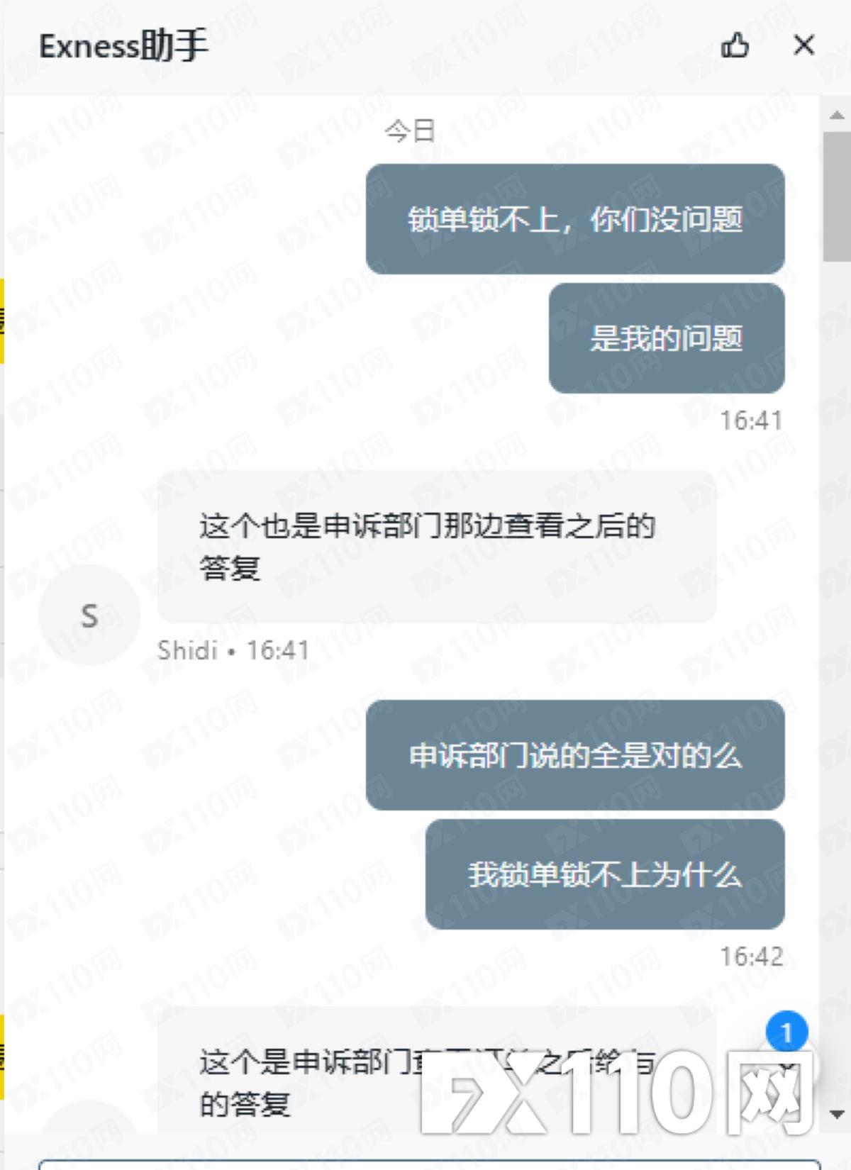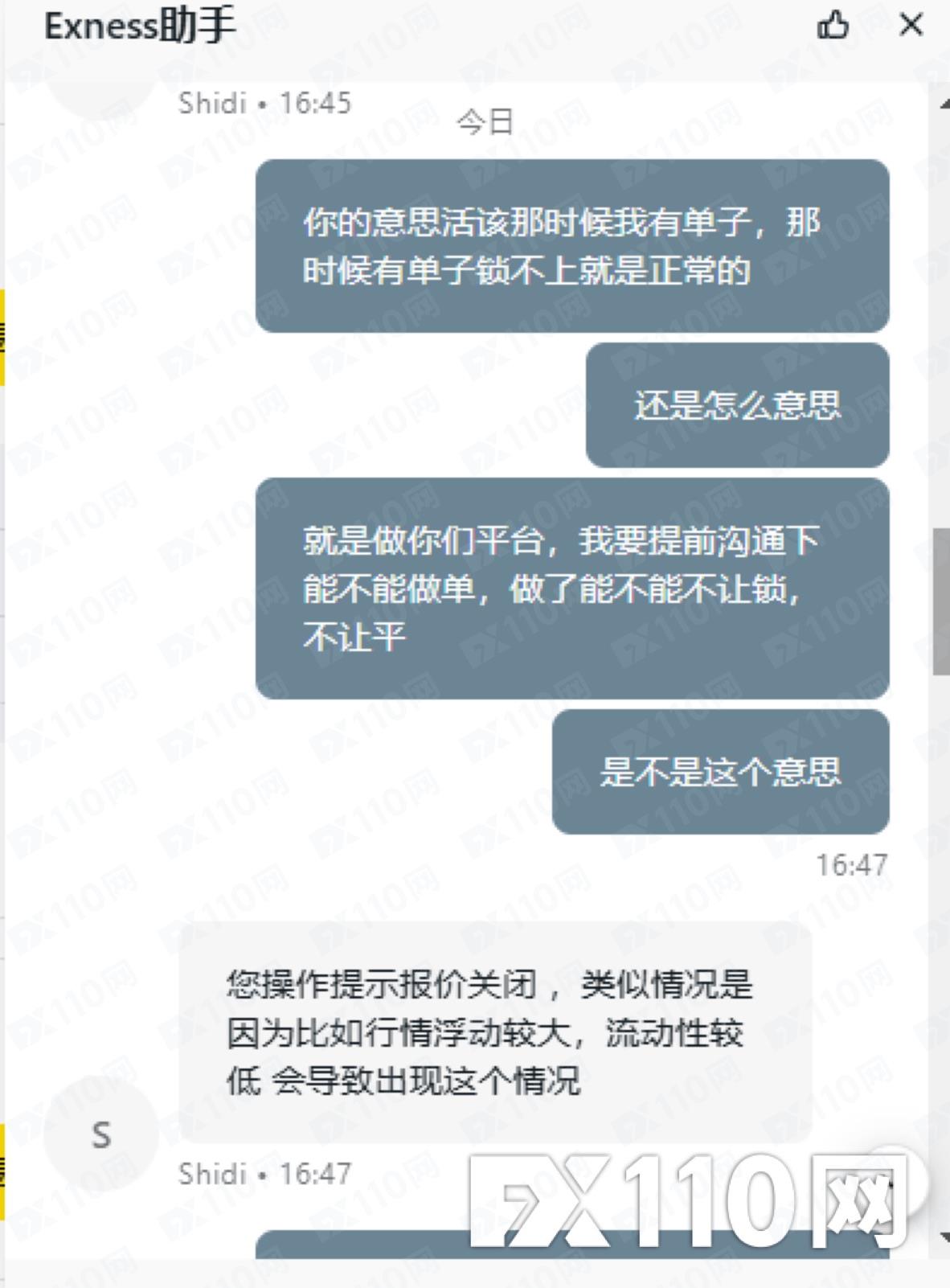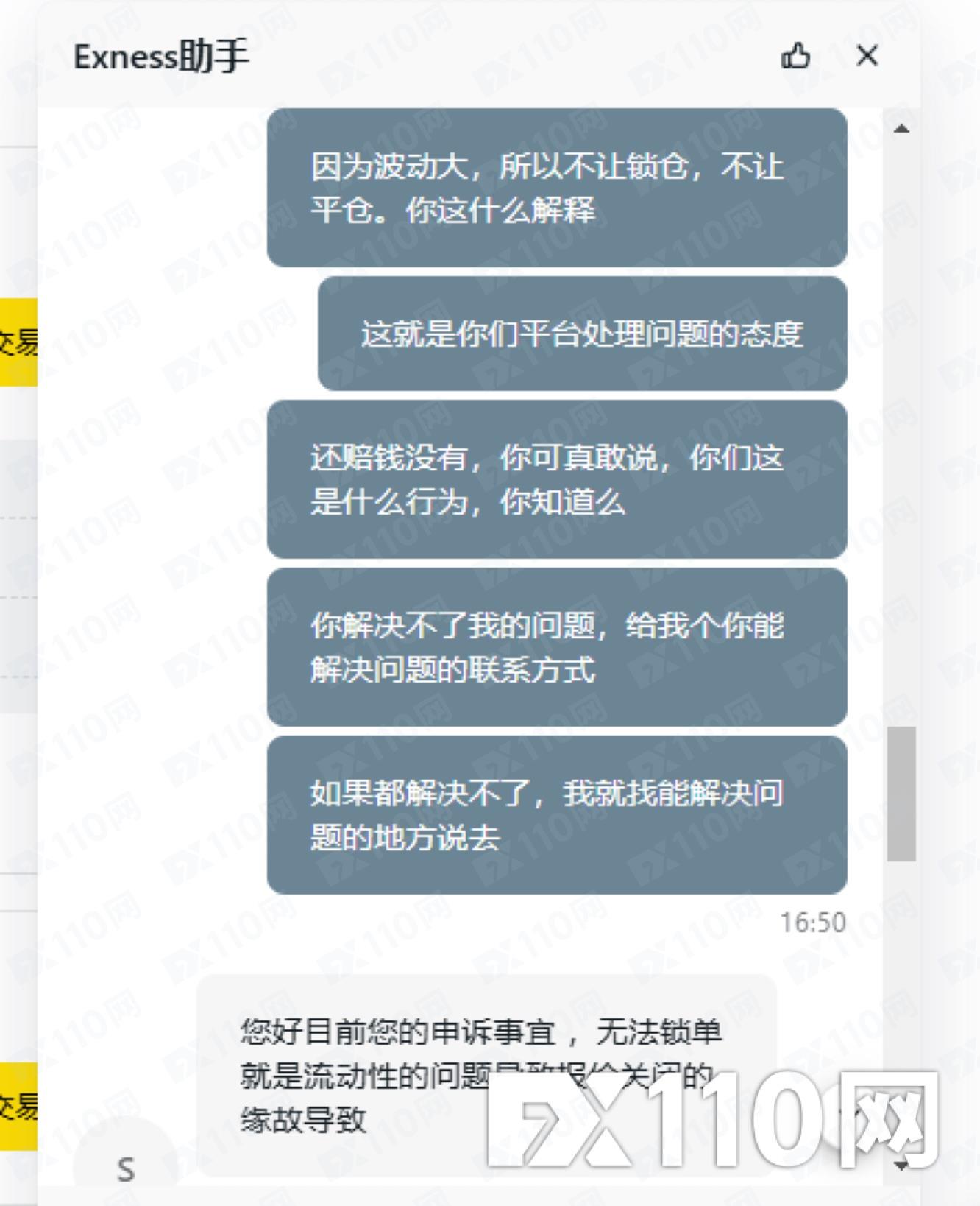 進單後,不能鎖倉不能平倉,平台給的回覆是那時間浮動大不能鎖倉平倉是正常的。單子能不能平要平台決定這樣的平台還怎麼做,這和搶有什麼差別。就算是撮合成交,單量不大,多委託幾次,單子也一樣會平出去或鎖上。他這平台這純欺負人呢。希望能幫忙回饋下,賠我的損失。下圖是我向exness平台申訴後回覆的郵件,還有和客服的紀錄。
