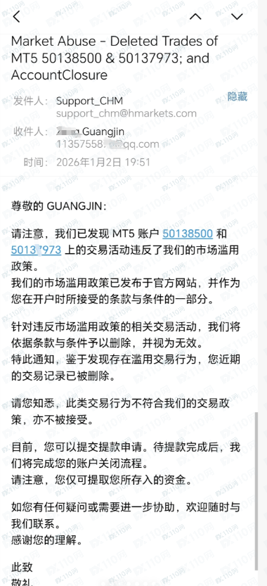2025年12月最後一個星期我在Hantec Markets入金交易,入金5000美金。這週黃金白銀行情巨大,暴漲暴跌。黃金波幅兩三百美金,家常便飯。我和我的朋友們僥倖幸運氣好,過程中帳戶翻了10倍。理應享有元旦的美好假期,2026年再接再厲。沒想到一封郵件直接,說違規交易。直接判只給本金。這不亞於晴天霹靂。請廣大網友記住這個平台!避雷! !
