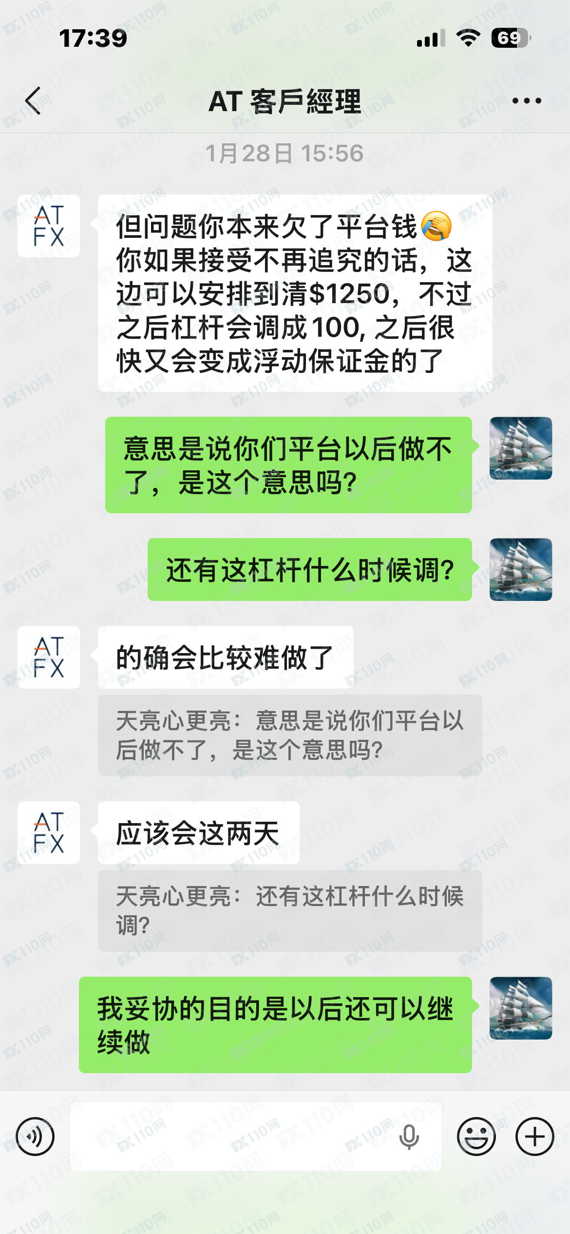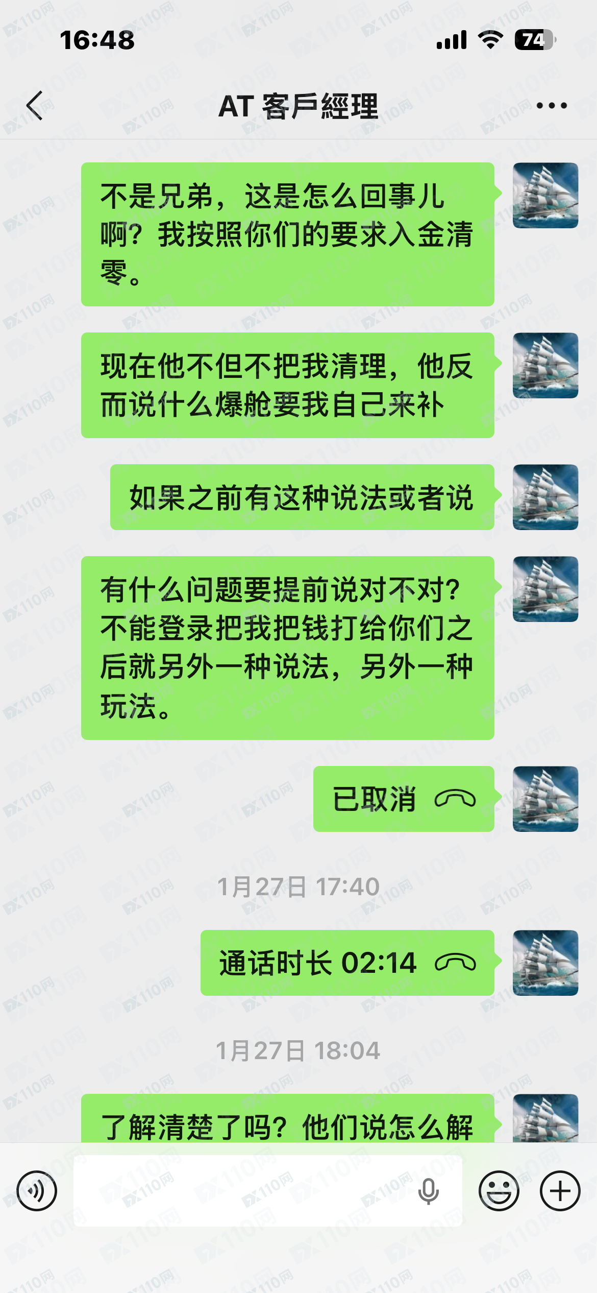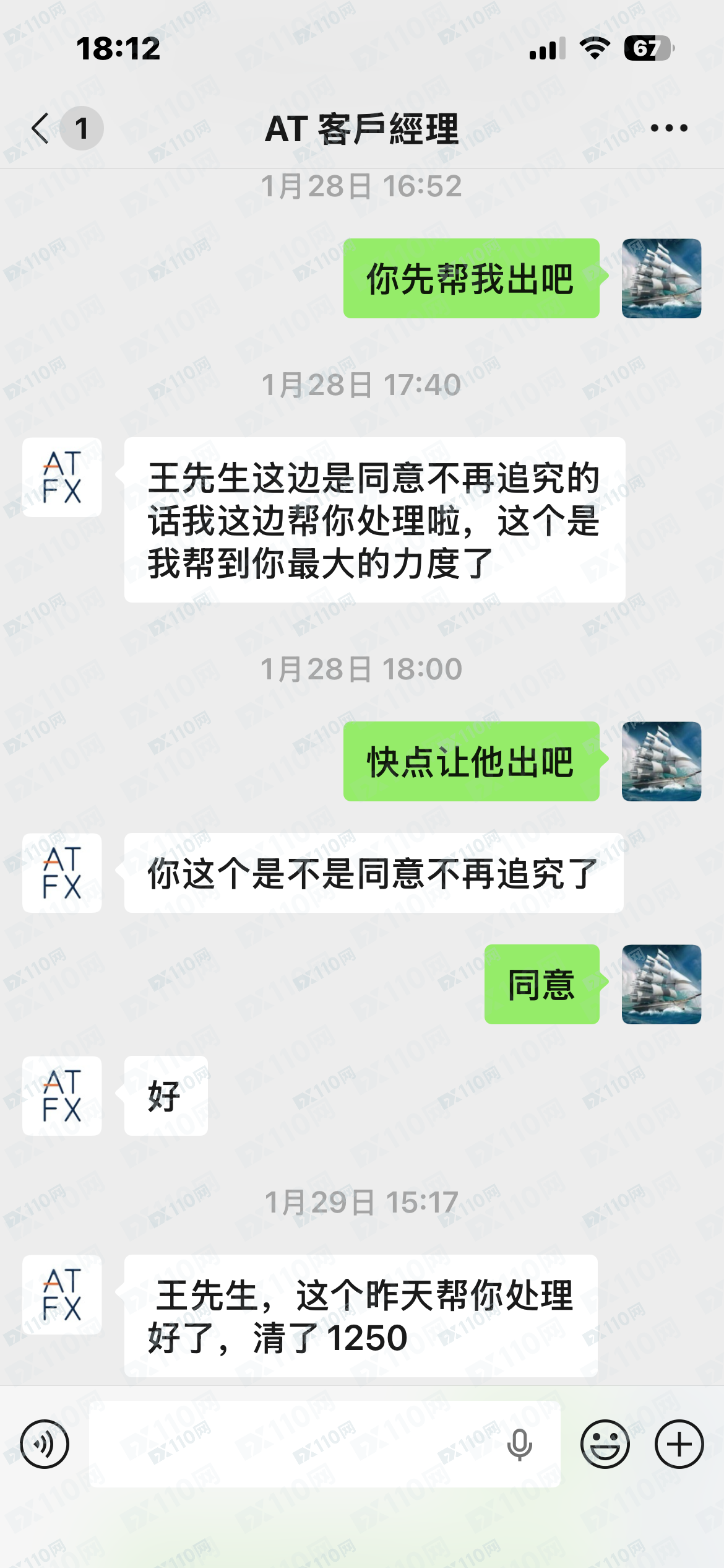 我在這個ATFX平台做了幾年了,在今年的1月27日入金了4600美元後,他們以我穿倉 為理由扣除了我2500美元,只讓我出2100美元,他們之前規定就是穿倉只要入雙倍的資金,就可以把穿倉的錢清0。之後在多方的調解後,又給我出了1250美元,也就是說,我的本金,還有1250沒給我,他們這是在炸騙,所以我要把這種平台爆光出來,讓廣大股友認識這種炸騙平台,別讓他人上當。