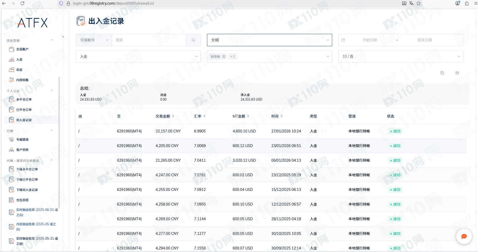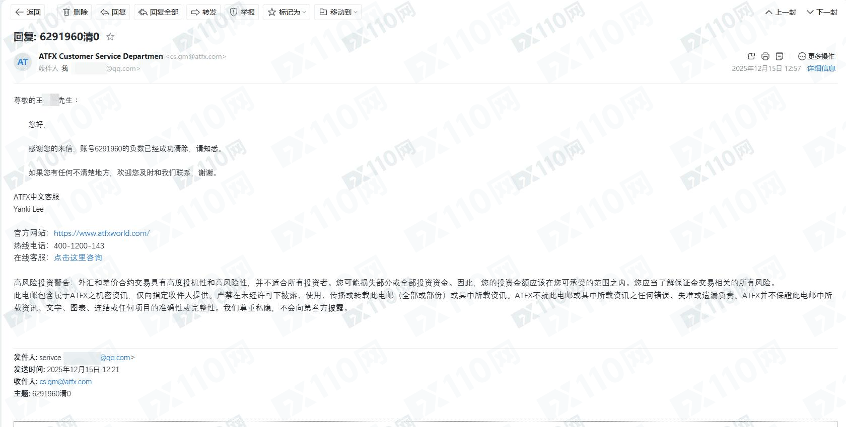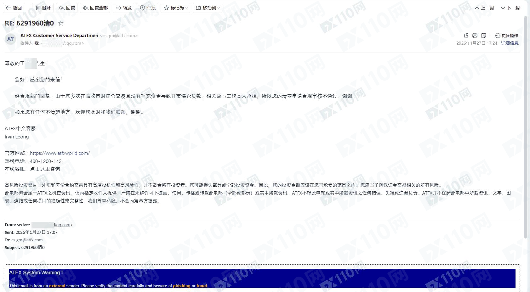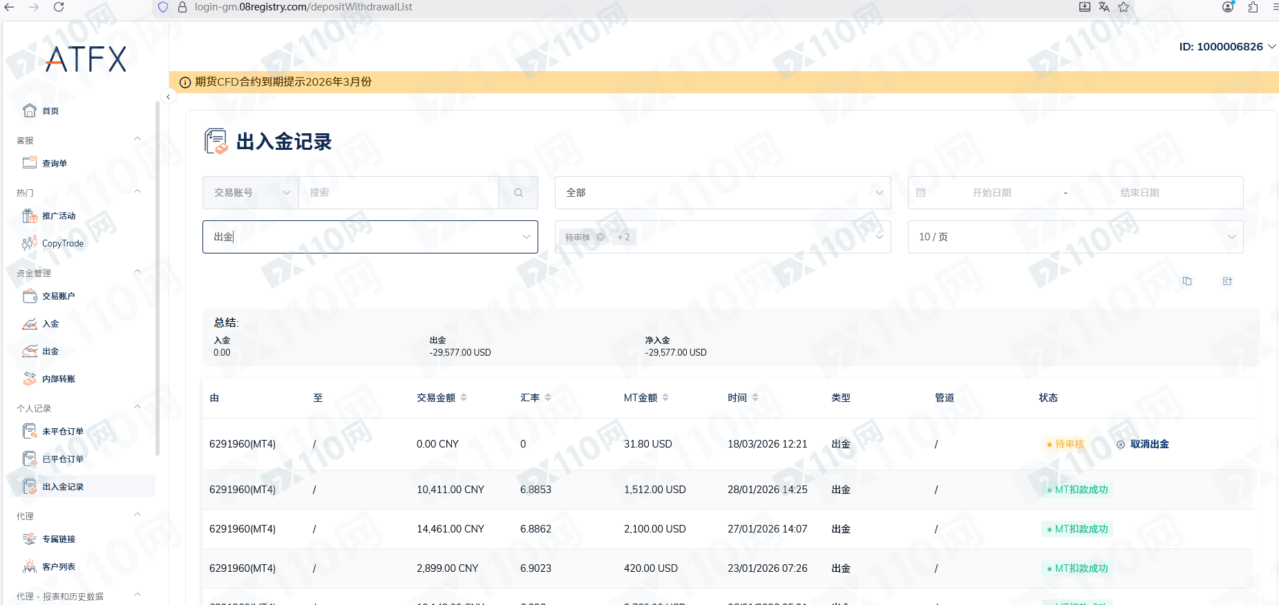 我在這個ATFX平台做了幾年了,在今年的1月27日入金了4600美元後,他們以我穿倉 為理由扣除了我2500美元,只讓我出2100美元,他們之前規定就是穿倉只要入雙倍的資金,就可以把穿倉的錢清0。之後在多方的調解後,又給我出了1250美元,也就是說,我的本金,還有1250沒給我,他們這是在炸騙,所以我要把這種平台爆光出來,讓廣大股友認識這種炸騙平台,別讓他人上當。