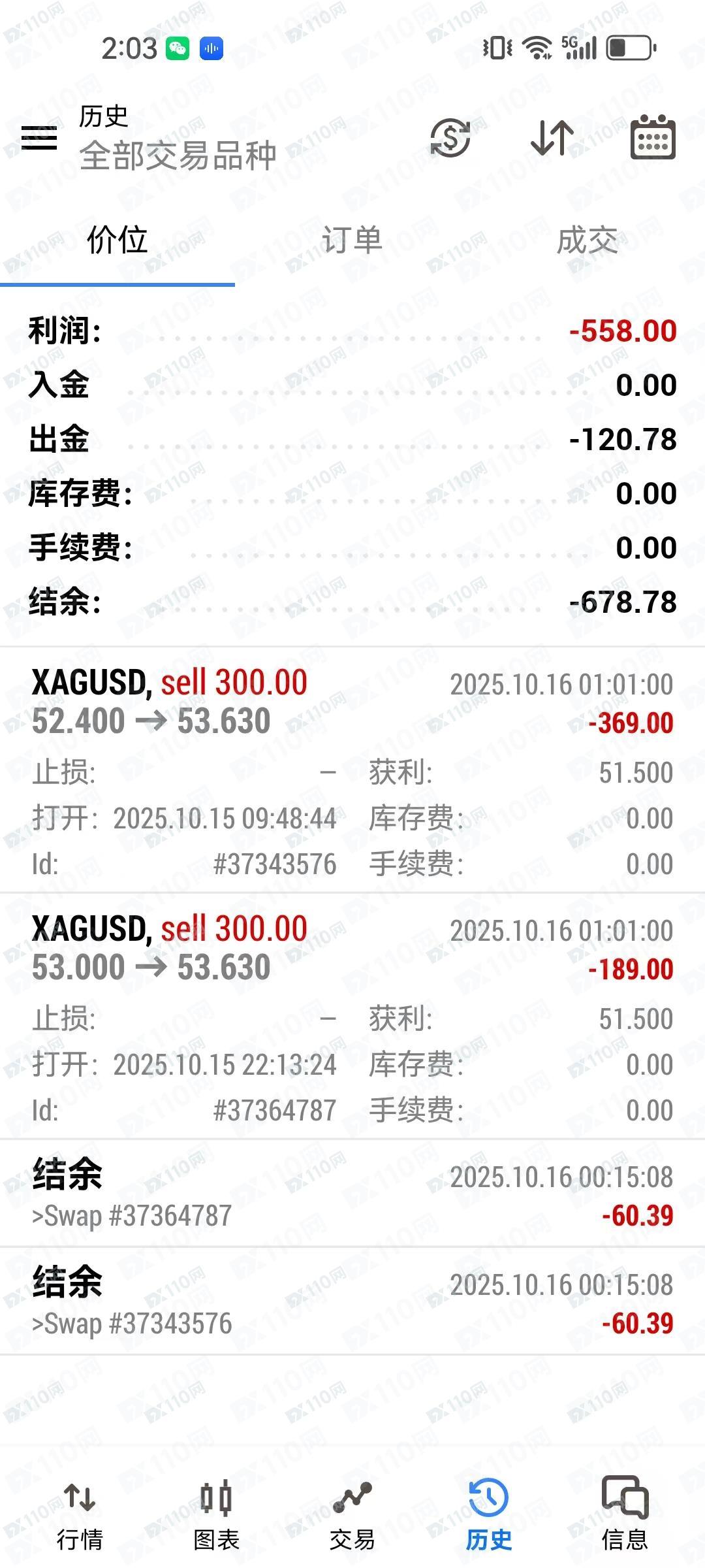 嘉盛集團交易白銀,2025年10月16日凌晨1點01分,以53.630的價格平倉了2單0.3手的白銀空單,改時間段顯示的白銀成交價格為53.09,整個晚上最高價也沒超過53.20,更離譜的是過夜費扣除了120.78美元。嘉盛客服給的回覆是點差大屬於正常現象,隔夜費也屬於正常。