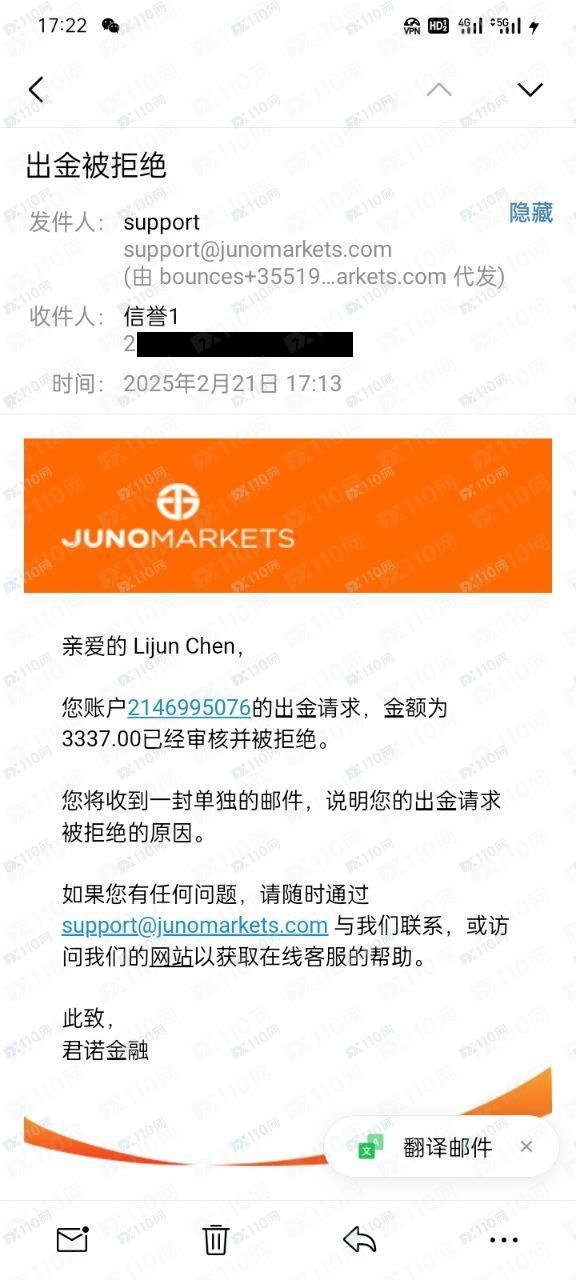 本人2025年2月18號在外匯平台君諾金融Juno Markets註冊帳號,19號獲利683美金,20號獲利363美金,21號獲利2200美金,一起總共獲利將近3300美金。平倉以後後台申請出獲利金3,300美金,平台以操作違規為由私自扣除3,300獲利金。詢問平台,平台一直未給予合理解釋,發送郵件要求退還3300美金獲利金,平台也未回覆。所以,希望透過平台曝光 黑平台君諾金融。