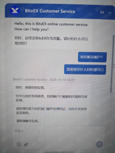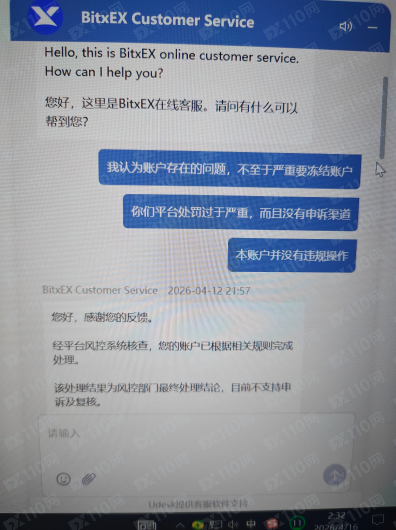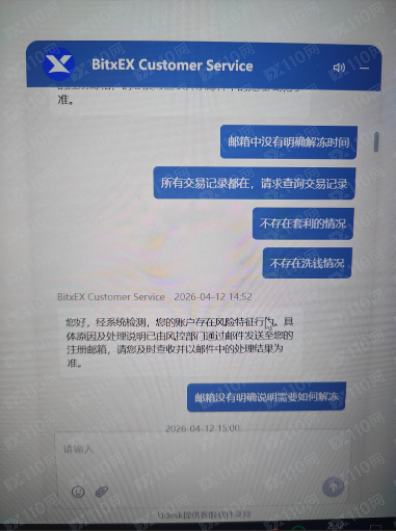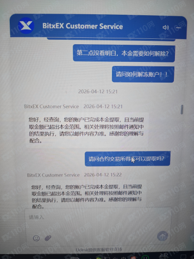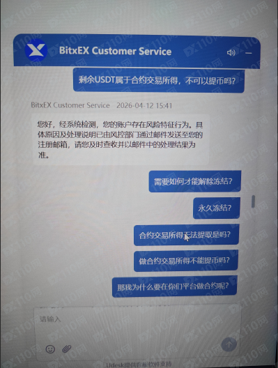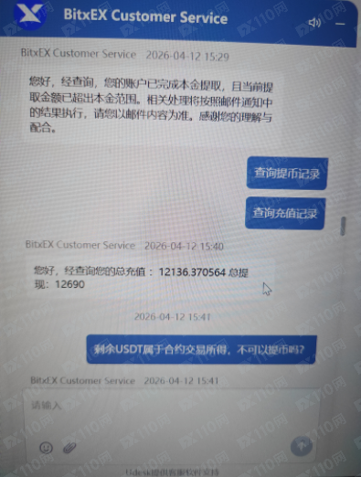2026年3月28號,朋友介紹bitxex平台,因為槓桿高,所以入金做合約交易,前後總共充值提幣12000U左右,浮盈12600U在帳戶,4月13號提幣被告知套利和多設備登錄行為被平台凍結,與客服衍客服以回應巴士服務結果為無郵件服務。