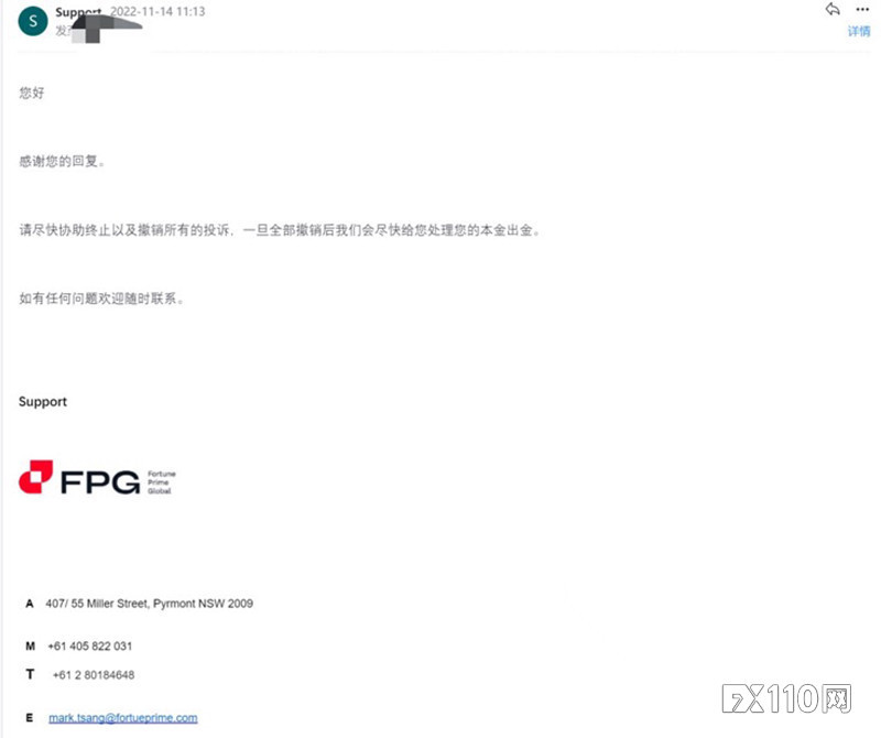 「把這個投訴刪了吧,平台說不刪本金不給我出了」,在向FX110網發出投訴4天後,匯友又說出了這麼一句話,而他口中的「平台」指的是FPG 財盛國際(下文統稱FPG)。