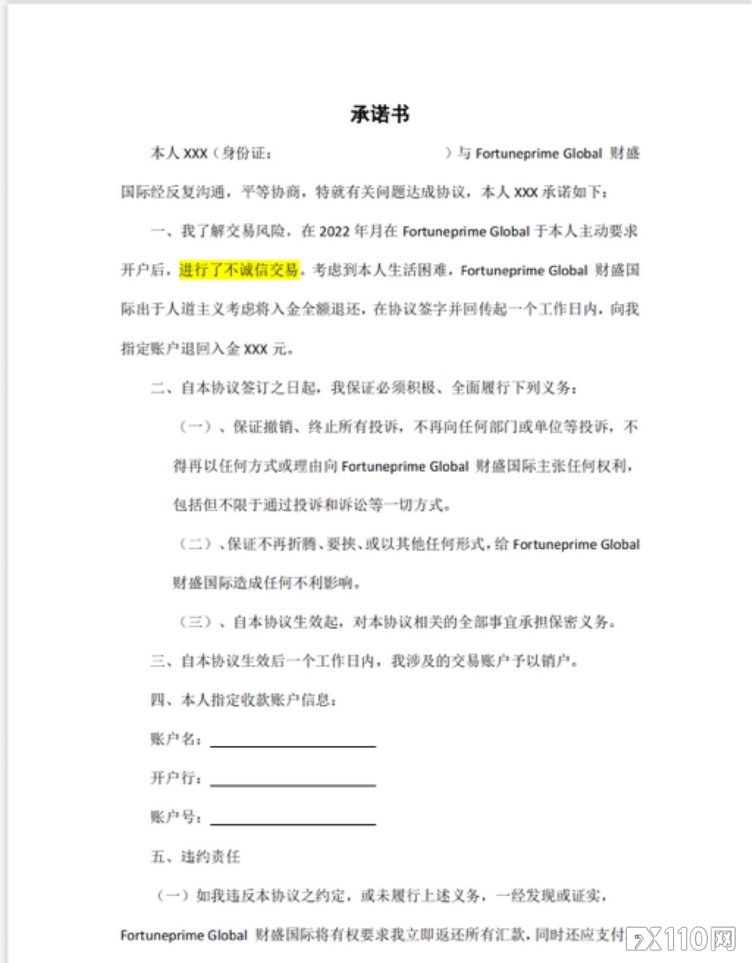 此外,平台還發來一份「承諾書」,要求匯友簽名確認,保證撤銷、終止所有投訴,不再向任何部門或單位等投訴,簽字確認後平台才退回其本金,而一旦違反約定,平台有權要求匯友立即返還所有匯款。( 相關閱讀:平台不出金怎麼辦?四個常見情況 FX110教你應對! )