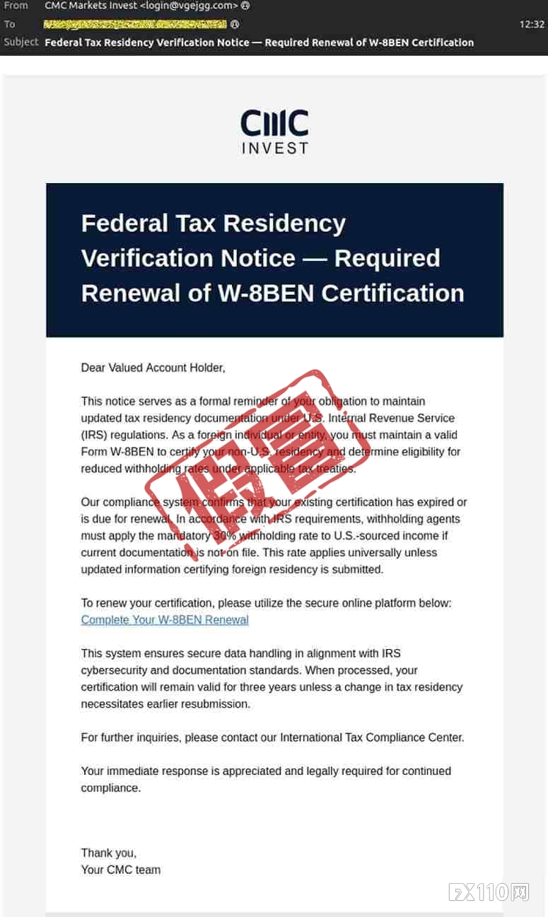 此次釣魚活動冒充CMC Markets和TD Direct Investing,目的是竊取用戶的登錄憑證。釣魚郵件主題多為《聯邦稅務居民身份驗證通知——請及時更新W-8BEN PMC認證》,行文專業,甚至附有法律聲明,極具迷惑性。郵件內嵌的鏈接會將用戶導向偽造的登錄頁面,一旦輸入賬號密碼,個人信息便將落入騙子手中。
