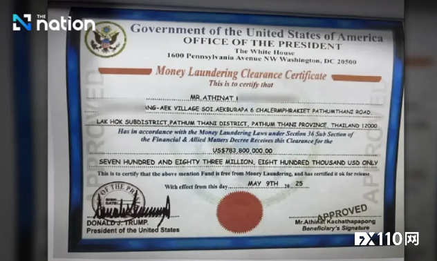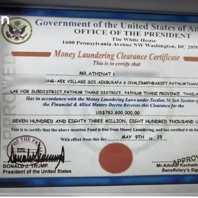 該證書偽造特朗普簽名,聲稱確認一筆7.838億美元資金“安全且未涉及洗錢”,并列出嫌疑人阿提納特的名字,意圖騙取受害者信任。詐騙過程中,團伙通過酒店宣講會、社交媒體群組等方式吸引投資者,出示偽造文件,并承諾“三個月內回報20倍”。部分受害者深信不疑,甚至借款追加投資,但到期后嫌疑人以各種理由拖延兌付,最終失聯。