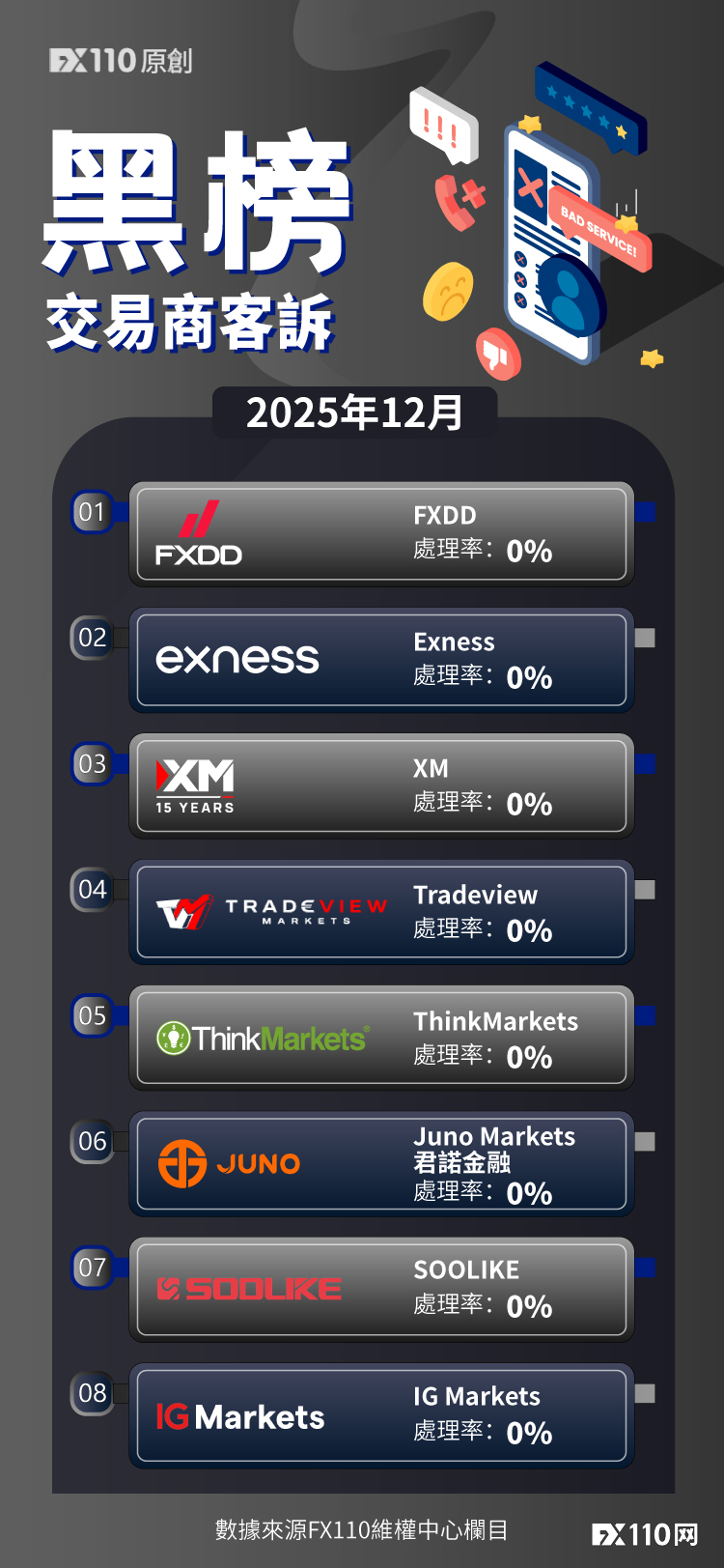 很多坑并不需要親自去踩才看得清,一家交易商好不好,從其投資者的口碑中可窺知一二。交易商對于客訴問題的處理效率展示了其客服辦事效率和服務態度,從側面也反應出交易商對于客訴的重視程度。接下來,我們一起來看看2025年12月份有哪些交易商登上了客訴黑榜。