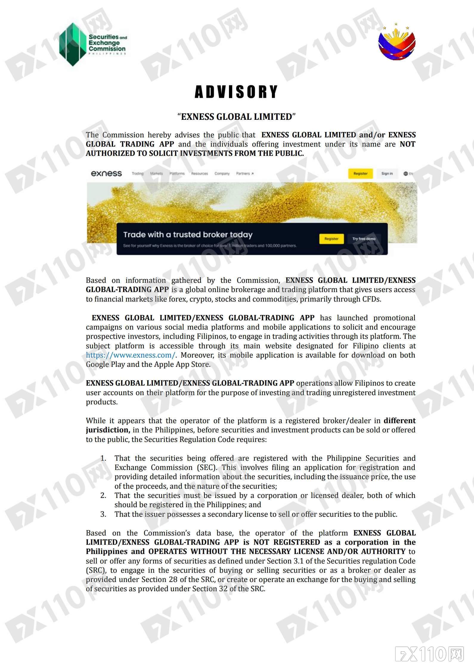 繼多起投訴后,Exness再出事。昨日,菲律賓證券交易委員會(SEC) 發布正式公告,點名EXNESS GLOBAL LIMITED、EXNESS GLOBAL TRADING APP 在菲律賓無牌經營,提醒公眾高度警惕。