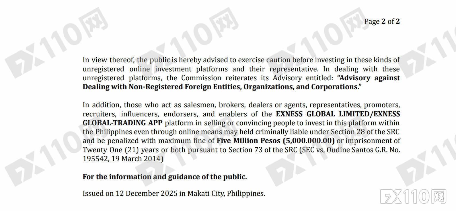 更嚴重的是,SEC 明確警告:任何在菲律賓境內拉人推廣、代言、招募或勸誘投資該平臺者,均可能構成刑事犯罪,最高面臨500萬比索罰款或21年監禁,或兩者并罰。
