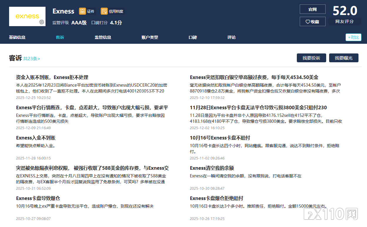 在FX110網查詢可知,Exness如今的評分已經降到了52分,且面臨大量客訴。