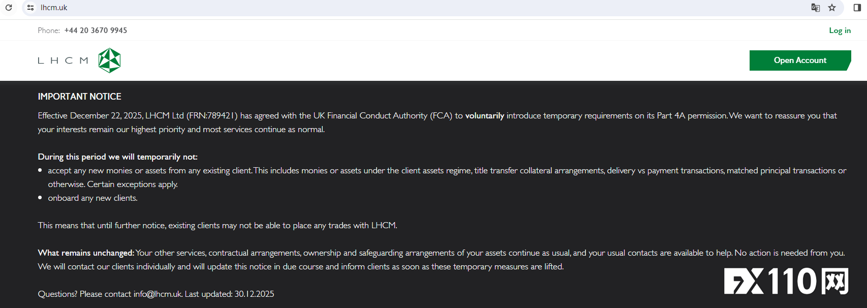 英國金融行為監管局(FCA)持牌經紀商LHCM(隸屬于國際金融集團Exante)近日在其官網發布通知,宣布已“自愿并與FCA達成一致”,自2025年12月22日起暫停接受新客戶開戶,同時停止接收現有客戶的任何新增資金。