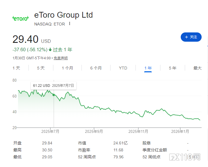 在線經紀商eToro(納斯達克代碼:ETOR)近期股價表現持續低迷,引發公共市場投資者日益加劇的擔憂。上周五,該公司股價再度下跌2.7%,盤中一度觸及29.05美元的歷史低點,最終收于29.40美元,這是自2025年5月上市以來其股價首次跌破30美元關口。