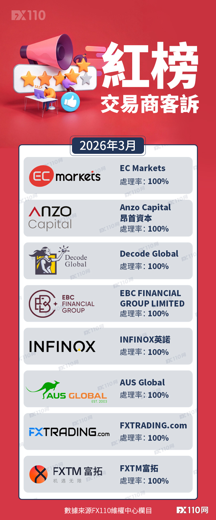 交易商對于客訴問題的處理效率展示了其客服辦事效率和服務態度,從側面也反應出交易商對于客訴的重視程度。接下來,我們一起來看看2026年3月交易商客訴紅榜。