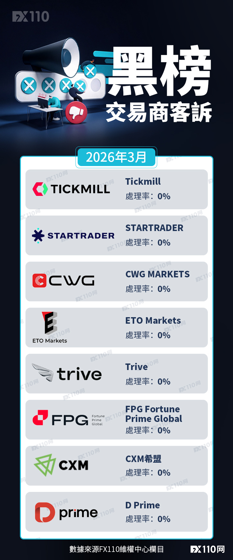 3月交易商客訴黑榜名單進行了“大洗牌”,上榜的交易商共8家,客訴處理率均為0%,未有連續上榜的交易商。上榜的交易商分別為Tickmill、STARTRADER、CWG MARKETS、ETO Markets、Trive、FPG Fortune Prime Global、CXM希盟、D Prime。