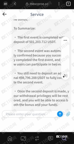 近期,一匯友投訴稱,其在MEXC交易所(網址為mexcproe.cc,系假冒)參與了所謂的“新用戶充值福利”活動,累計存入超過50萬USDT(1 USDT=1美元)后,不僅未能獲得承諾的5.8888萬USDT獎勵,反而被平臺以“自動參與了第二項活動”為由,要求再存入近50萬USDT才可恢復提現權限......